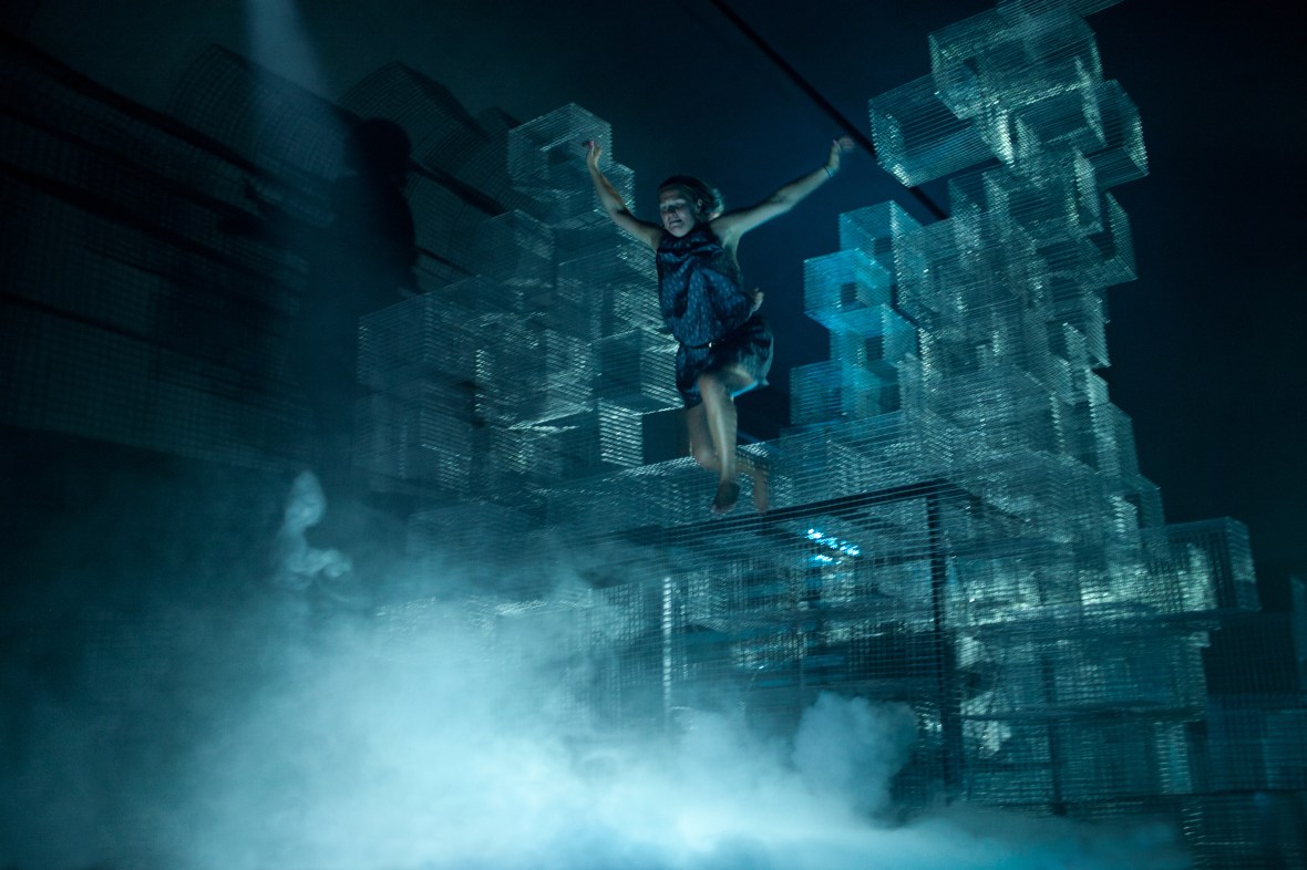 Fog machines, metal, fans, neons. Dimensions variable. Courtesy National Art Gallery Zachęta, Warsaw. Photo: Maciej Landsberg.