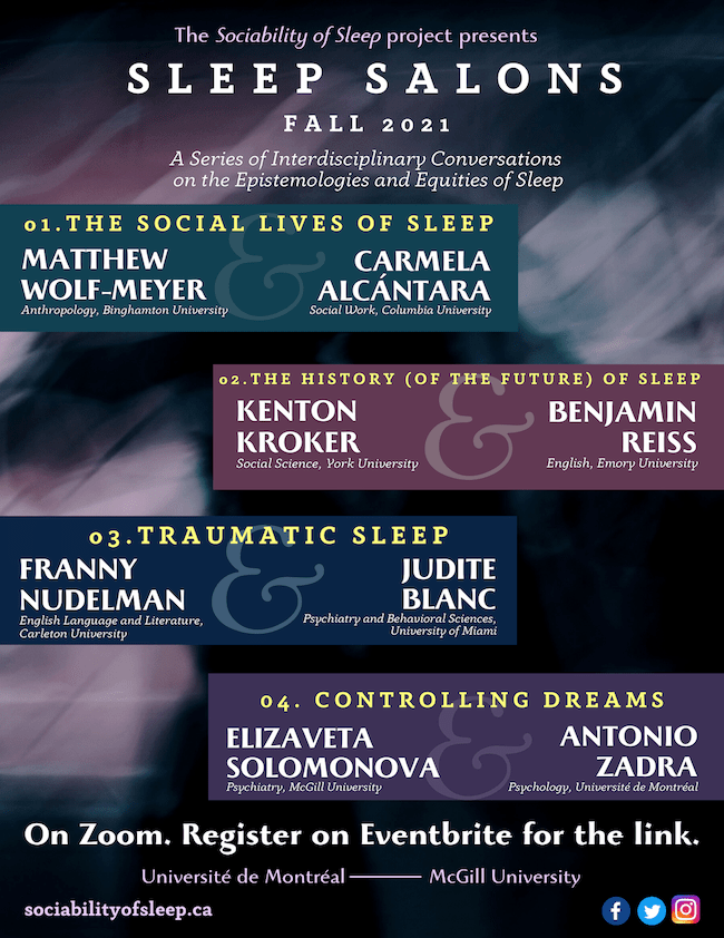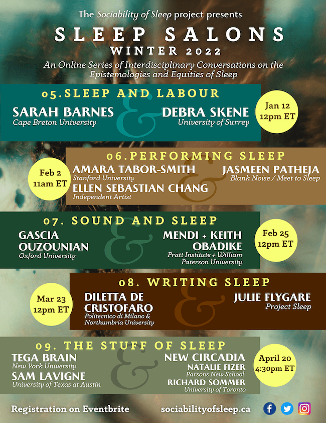 Detailed information for all the salons and speakers on the dedicated page of the Sociability of Sleep website. Eventbrite to register You Tube channel for video recordings of the salons. Salon no. 5 : Sleep and Labour Speakers: ✦ Sarah Barnes (Cape Breton University)✦ Debra Skene (University of Surrey) The rise of the modern, industrial workday also put sleep “on the clock.” As an optimizable activity of rest and recovery, sleep has arguably become as much a part of our work lives as work itself. This salon explores sleep as an experimental (and monetizable) zone of performance enhancement and bodily entrainment, considering the seemingly extreme cases of professional athletes and hospital shift workers to reveal the tensions we all experience between the social and biological demands of work and rest. Salon no. 6 : Performing Sleep Speakers: ✦ Amara Tabor-Smith (Stanford University + Ellen Sebastian Chang (iIrector, Producer, Educator)✦ Jasmeen Patheja (Artist) Sleep is usually associated with personal environments and the literal and metaphorical withdrawal from the outside world; so the spectacle of sleeping in …